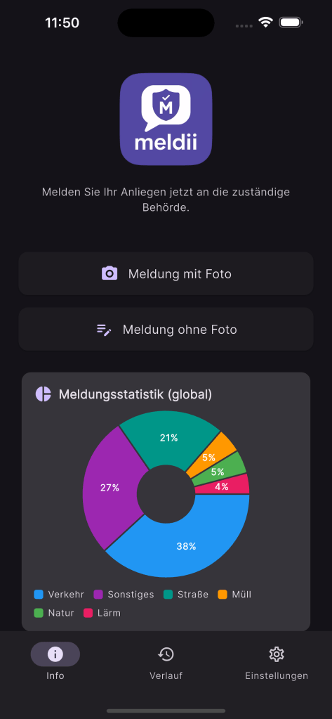 Meldii ist Ihre digitale Brücke zu den zuständigen Behörden. Mit nur wenigen Klicks und AI Support können Sie Meldungen direkt an das zuständige Amt oder andere Ansprechpartner senden – ob es sich um Müllablagerungen, Falschparker, defekte Straßenlaternen oder andere Anliegen handelt.